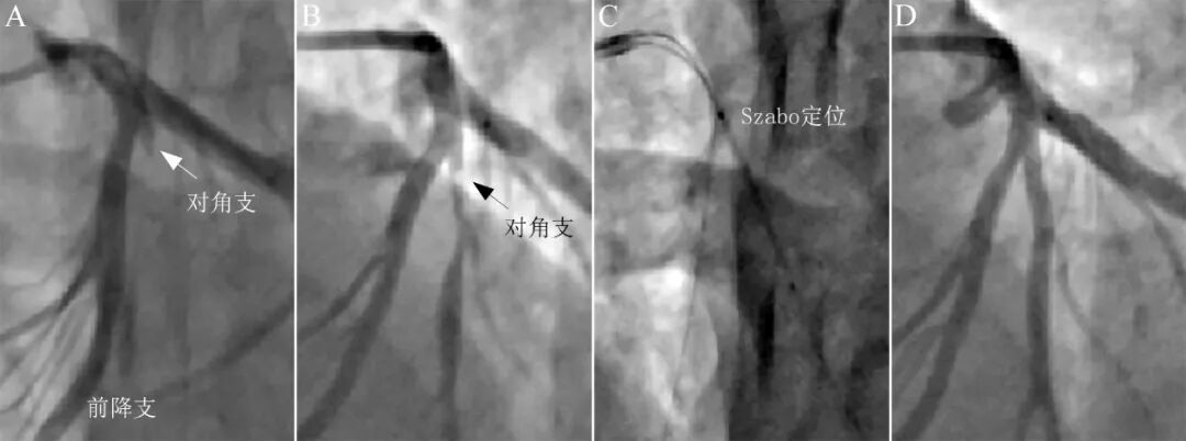 40岁吸烟男性,胸痛1天,心电图诊断为急性高侧壁心肌梗死。造影显示前降支近中段狭窄40%,第一对角支开口完全闭塞(A)。Sion导丝顺利通过,预扩张后提示对角支粗大,近段残余狭窄90%,开口部1-2mm基本正常,决定采用Szabo技术。齐平对角支开口植入支架(C),造影结果良好(D)。