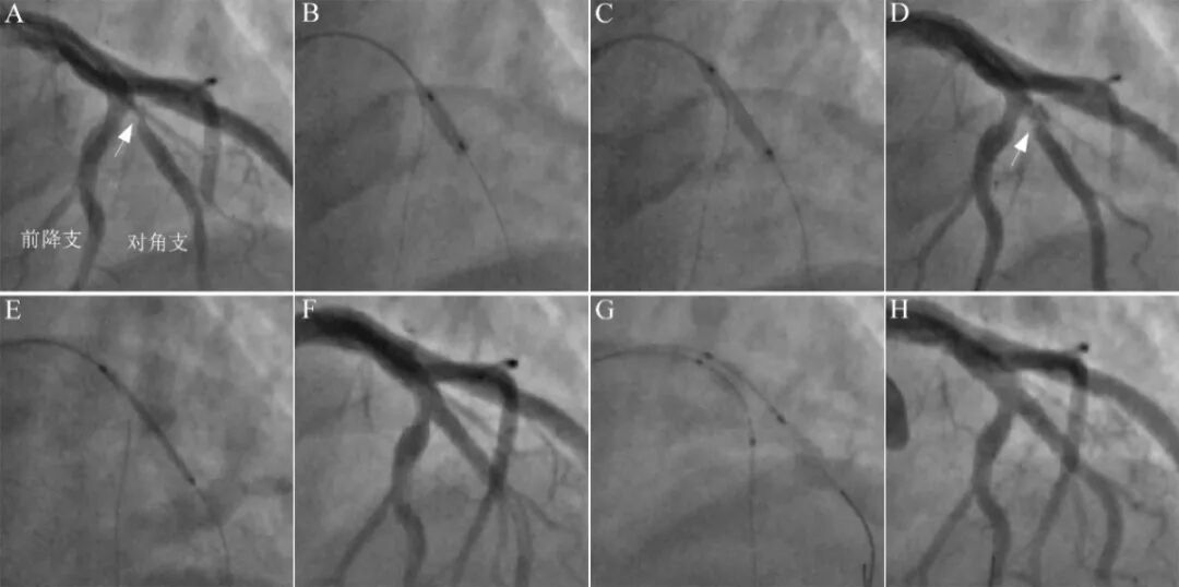 对角支开口狭窄80%,前降支狭窄20%(A)。前降支4.0×20mm球囊4atm低压扩张,同时对角支3.0×13mm支架回拉,遭遇阻力并出现压迹时,16atm释放支架(B),最后结果良好。