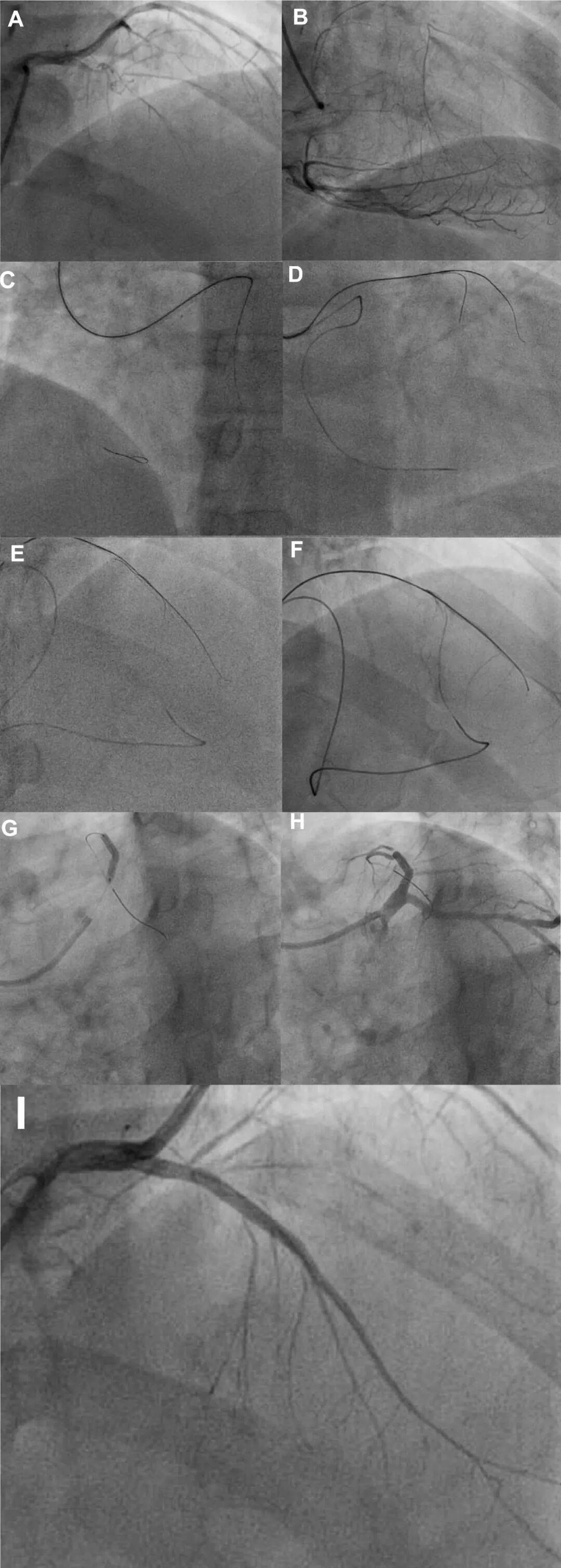 (A)LAD开口近端CTO病变。(B)发育良好的室间隔侧支血管供应LAD远端。(C)工作导丝成功从左侧指引导管进入右冠脉开口,随后深入至后降支。(D)150厘米的Corsair Pro微导管成功从左侧指引导管飞跃主动脉,进入右冠脉开口,并向远端推进至后降支。(E)逆向Sion Black导丝成功穿过室间隔侧支血管(侧支分级CC2)到达LAD远端。随后,在逆向导丝的引导下,ConquestPro 12导丝成功穿透CTO部位并推进至LAD远端。(F)冒烟确认正向导丝位于真腔内。(G)一枚药物支架成功植入LAD近端。(H和I)最终结果。