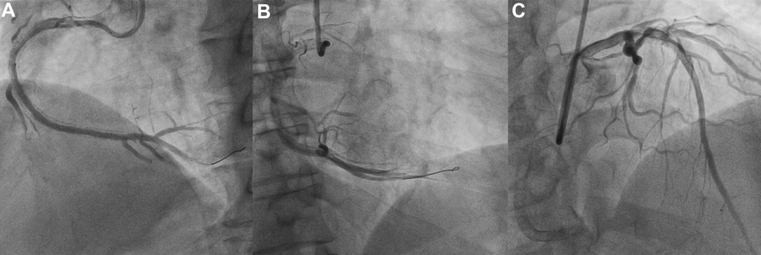 最终造影显示,支架贴壁良好,远端RCA达到TIMI3级血流(图5A、5B);左冠脉造影未发现侧支循环通道损伤(图5C)。