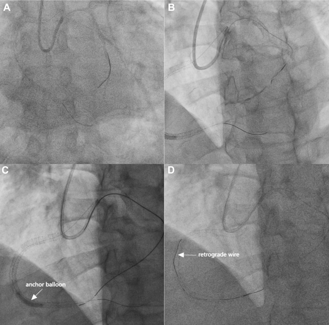(A至C)Suoh 03导丝成功通过心外膜侧支到达RCA远端,随后逆行微导管成功跟进。(D)逆行导丝成功推进至RCA近端。