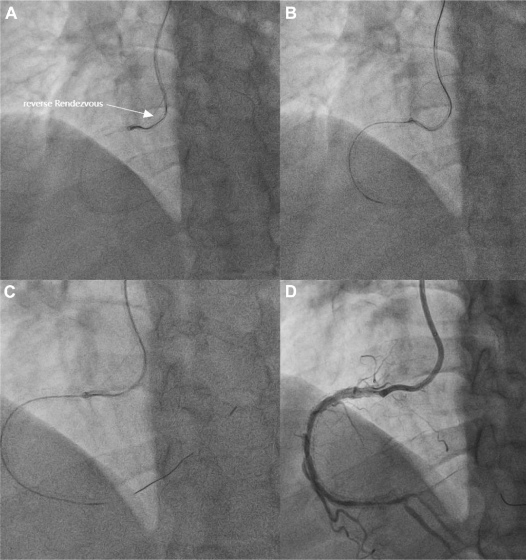 (A)AL 0.75指引导管中的反向rendezvous技术。(B)正向微导管通过逆向导丝送达RCA远端。(C和D)正向工作导丝成功送达RCA远端。
