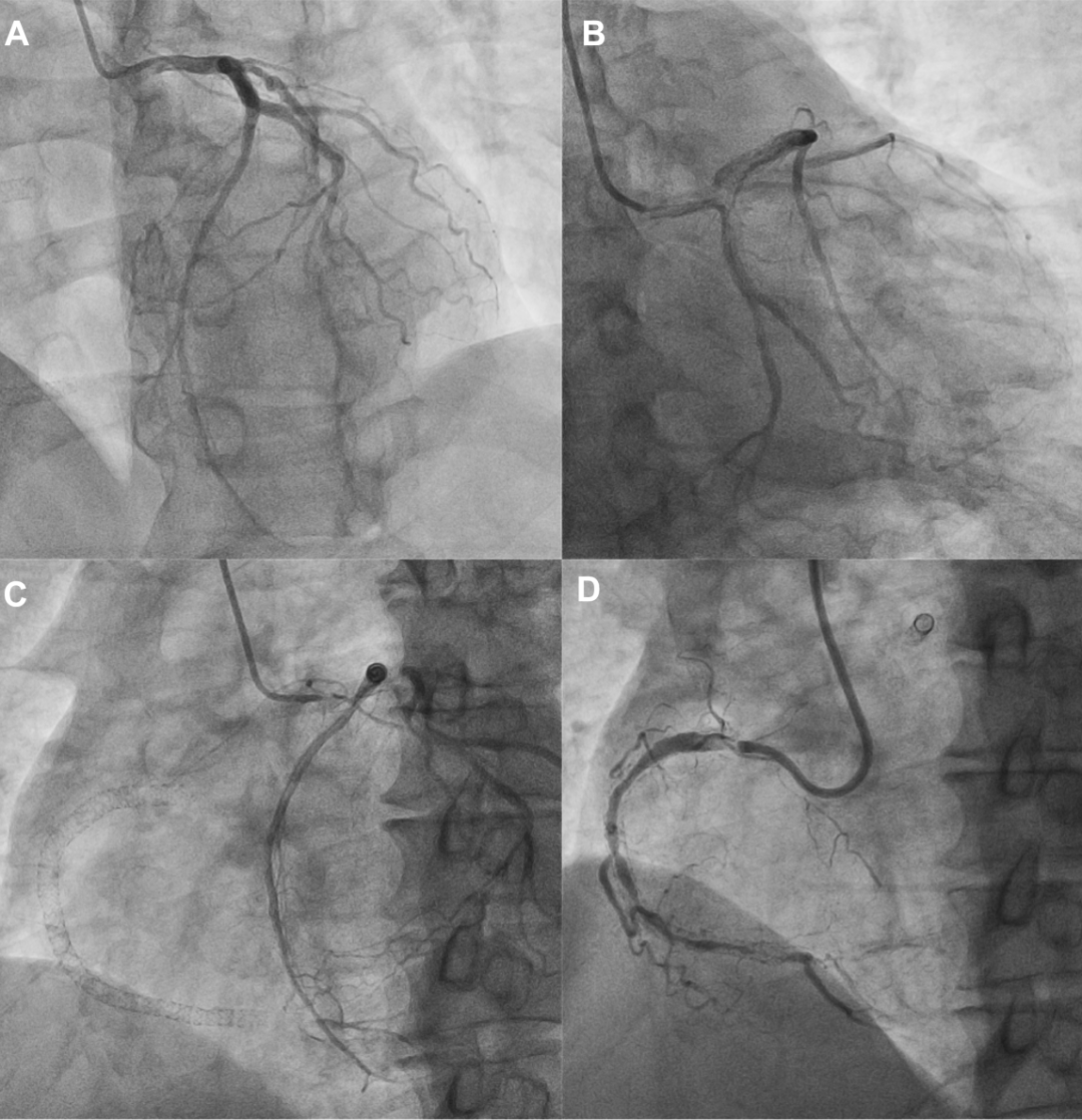 患者为56岁男性,有长达20年的心绞痛病史,既往曾接受过右冠状动脉(RCA)和左前降支(LAD)的PCI治疗。