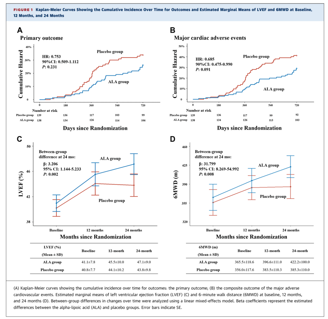 近期,复旦大学中山医院葛均波院士团队孙爱军教授在《JACC: HEART FAILURE》发表论文《Efficacy of Alpha-Lipoic Acid in Patients With Ischemic Heart Failure:A Double-Blind, Randomized, Placebo-Controlled Study》,旨在评估ALA作为标准药物治疗的辅助疗法在缺血性心力衰竭(IHF)患者中的疗效。