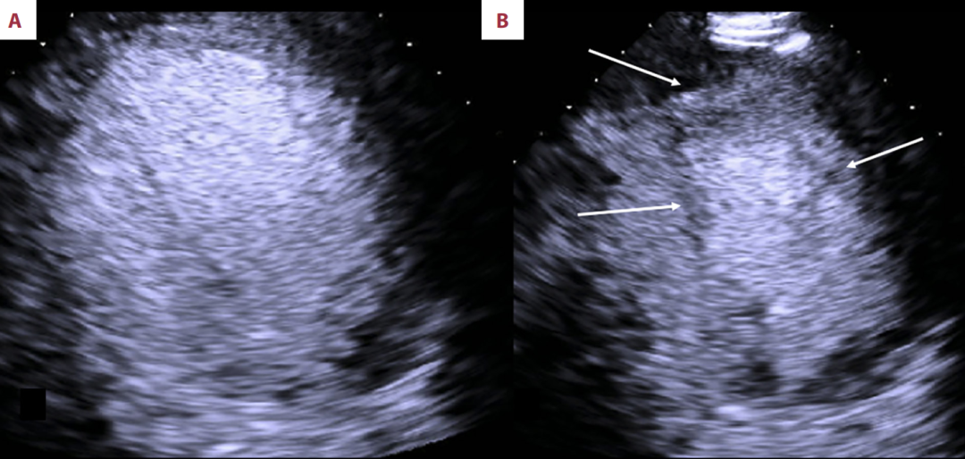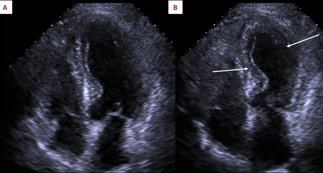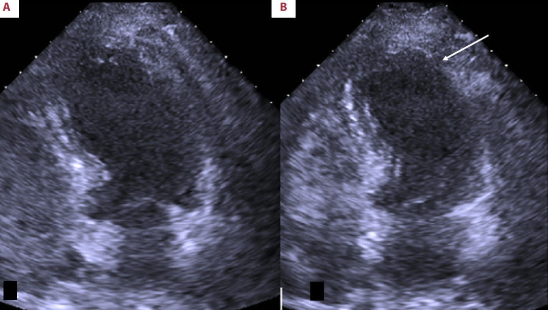2016年经胸超声心动图显示的心室四腔视图;舒张期(A)与收缩期(B)。B图中的箭头指示了收缩期间心室中段前外侧壁及心尖区域的运动缺失情况。