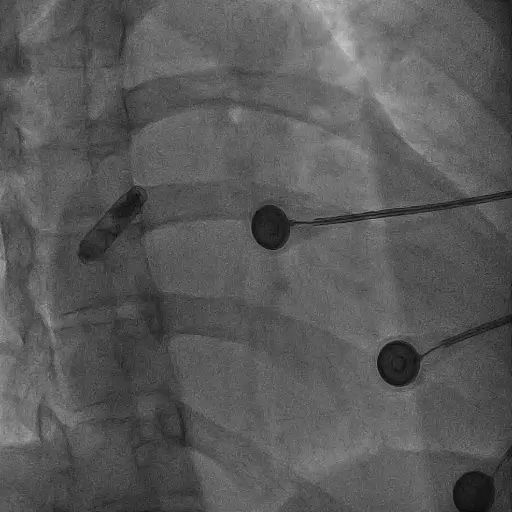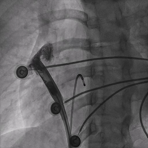 手术采用右侧股静脉微创入路,将无导线起搏器送至右心耳基底部。植入过程中,以 “固定可靠 + 电学参数表现理想” 为双重目标,在定位与旋入阶段,持续监测阻抗及损伤电流等即时反馈,以此评估组织接触质量与主动固定效果。