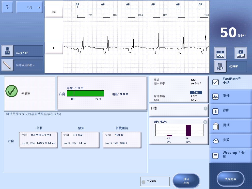 2026 年 1 月,北京协和医院程康安教授、陈太波教授为患者实施了 AVIER™ AR心房无导线起搏器植入手术。手术团队提前周密部署,术中先为患者放置临时起搏电极并进行心房起搏测试,确认可实现 120 次/分 心房起搏下,房室结1:1的传导,且右心耳基底部起搏阈值正常,完全满足植入条件后,才开始植入心房无导线起搏器。