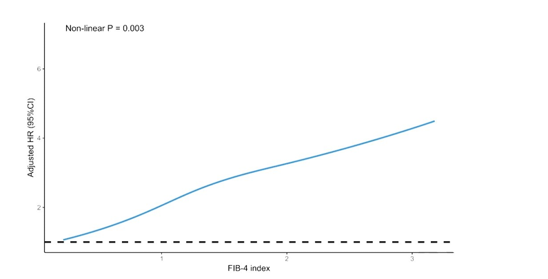 采用限制性立方样条进行剂量-反应分析显示:随FIB-4指数升高,SCA风险呈显著、近似单调上升趋势(非线性P=0.003;图3)。