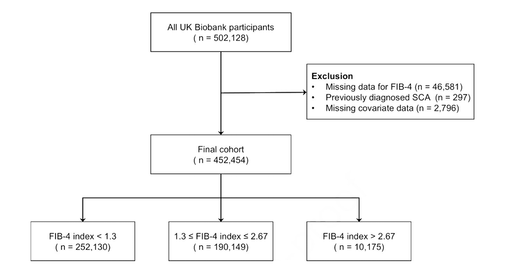 为填补这一关键的研究空白,研究者利用英国生物样本库队列的大规模前瞻性数据,采用经过充分验证、临床广泛应用的肝纤维化无创生物标志物Fibrosis-4 (FIB-4)指数,探讨其与新发SCA的关系。