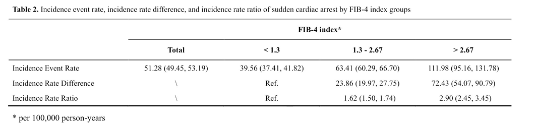 SCA总体发生率为51.28/10万人·年(95% CI:49.45–53.19),且与FIB-4指数呈强正相关;在高危组(FIB-4>2.67)中升至111.98/10万人·年(95% CI:95.16–131.78)。与参照组(FIB-4<1.30)相比,高危组的绝对率差为72.43/10万人·年(95% CI:54.07–90.79),对应发生率升高2.90 倍(95% CI:2.45–3.45)(表2)。
