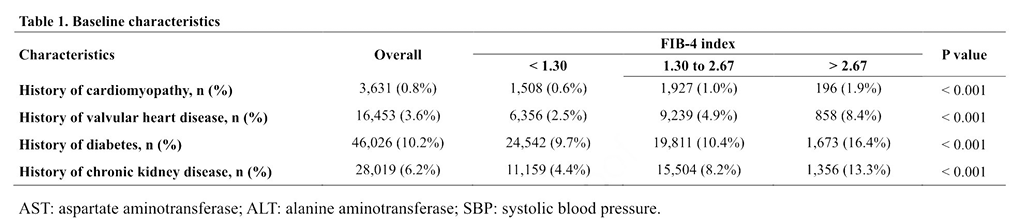 研究总体人群中位年龄58岁(IQR:50–63),男性占45.8%。基线时主要合并症患病率:高血压182 686例(40.4%)、糖尿病46026例(10.2%)、心力衰竭18947例(4.2%)、心肌梗死27027 例(6.0%)。FIB-4风险分组间呈现明显梯度分布:与低、中危组相比,高危组高血压、糖尿病、心肌梗死、心力衰竭、心肌病、心脏瓣膜病及慢性肾脏病的患病率均显著更高(所有P<0.001)(表1)。