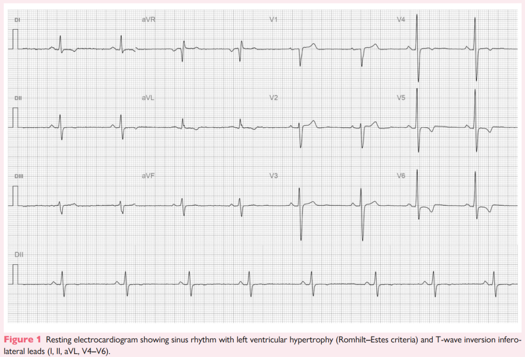静息心电图表现为窦性心律,符合左心室肥厚的Romhilt–Estes评分标准,下侧壁导联(I、II、aVL、V4–V6)存在T波倒置(图1),为HCM的典型心电图特征。
