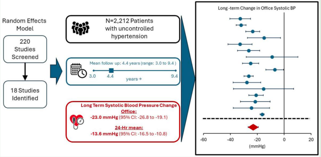 发表在欧洲心血管预防杂志上荟萃分析研究共纳入18项研究共2212例患者,旨在评估RDN治疗未控制高血压的长期降压结果。本项研究结果显示,平均随访4.4年,RDN术后患者诊室收缩压平均降低23.0 mmHg(P<0.05),24小时动态收缩压平均降低13.6mmHg(P<0.05),且降压效果在至少3年内持续稳定。同时,患者服用的降压药物数量略有减少,肾动脉并发症发生率仅为0.14%,该研究结果提示RDN具有持久的降压作用与良好的安全性。