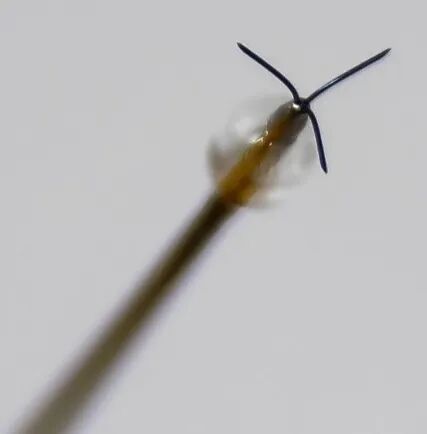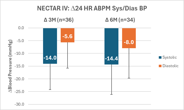 在2025年TCT年会上,由来自德国法兰克福心血管疾病中心的Horst Sievert医生汇报了NECTAR IV研究的6个月随访研究结果,该研究是一项多中心研究,旨在评估MDN对血糖与血压双重控制不佳的2型糖尿病合并高血压患者的疗效。该研究使用的消融导管7F指引导管,中心为球状结构。头端有3个微小针行电极的消融导管(如下图所示)可以通过将酒精注射到血管周围腔对直径3-7m的肝动脉和双侧肾动脉进行共消融。本研究共纳入39名患者,其中85%的患者接受了完整MDN治疗。术后6个月结果显示,手术安全性与NECTAR III一致,30天手术安全性终点达97.4%,仅发生1例与手术相关的并发症。HbA1c平均降低0.98%和24小时收缩压/舒张压平均降低14.4/8.0mmHg,均得到显著且持续的改善,72%患者24小时平均动态收缩压下降≥ 5 mmHg,62%下降≥ 10 mmHg。证明了MDN作为2型糖尿病合并药物难治性高血压患者的新治疗选择,降压和降糖效果有效性显著,并且多器官共消融有协同效应。