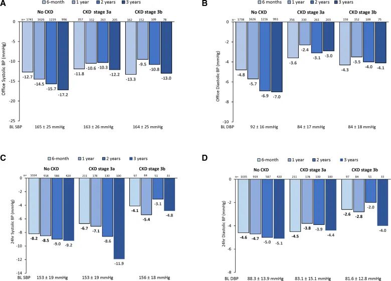 本研究是GSR研究是对合并中重度CKD高血压患者的亚组分析结果,平均随访3年后,与基线血压相比,未合并CKD组,CKD3a期组和CKD3b期组诊室收缩压分别下降17.2 mmHg,12.2 mmHg和13 mmHg组(p< 0.0001),三组的肾脏不良事件发生率均小于1.0%;与基线降压药物负荷剂量相比,未合并CKD组,CKD3a期组的降压药物负荷不变,CKD3b期组的降压药物负荷剂量明显下降(P=0.007)。
