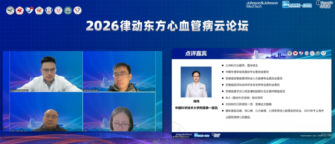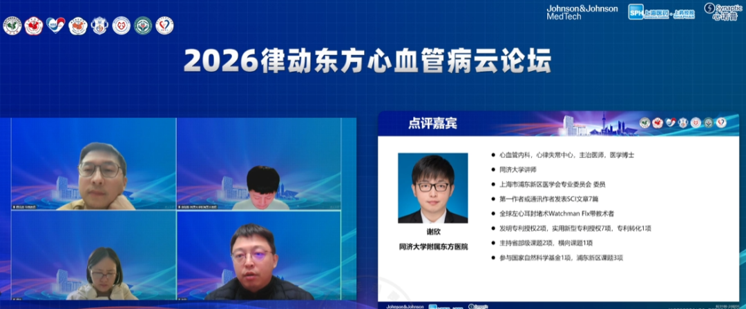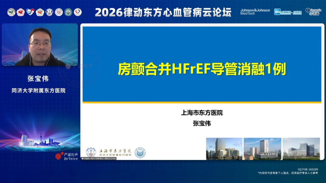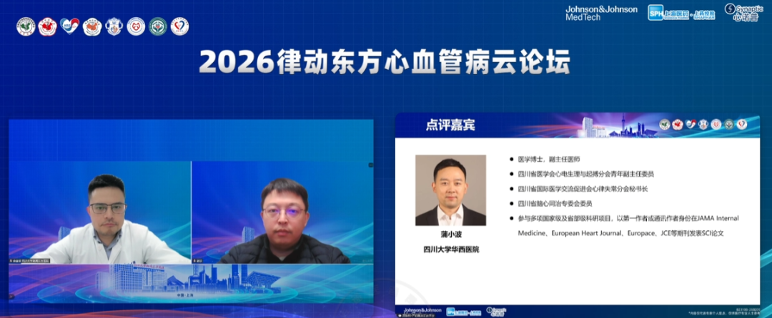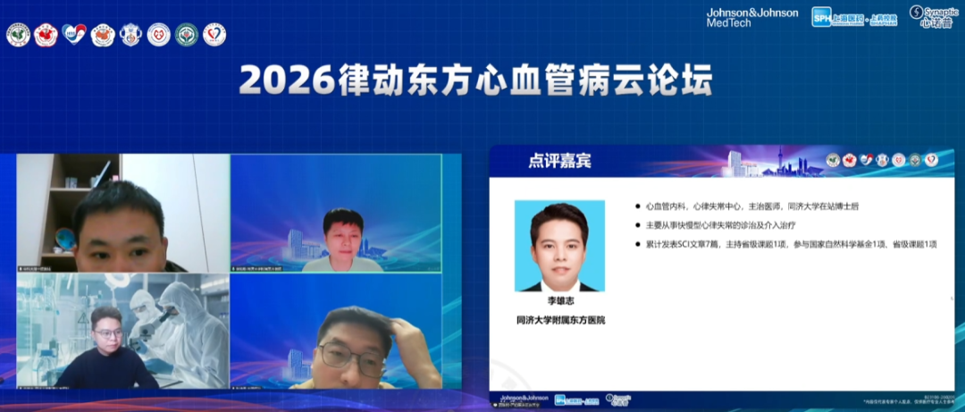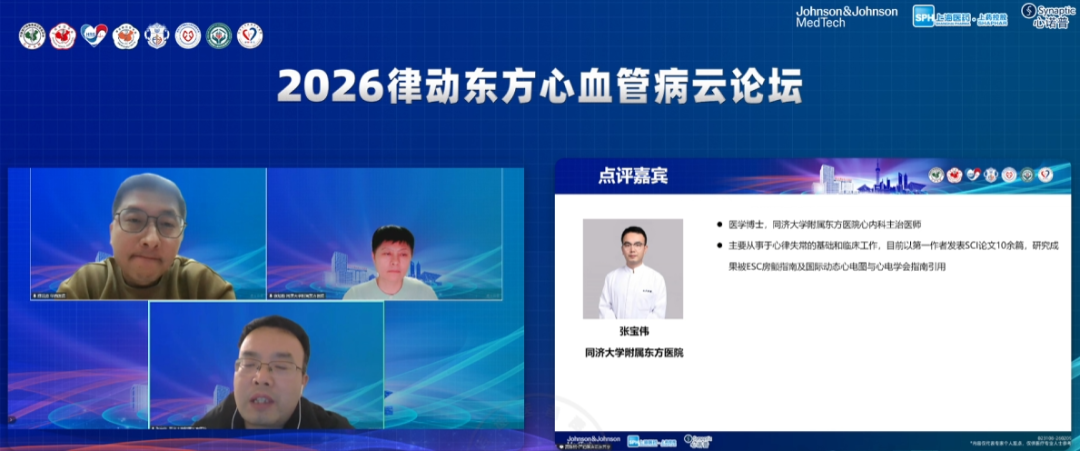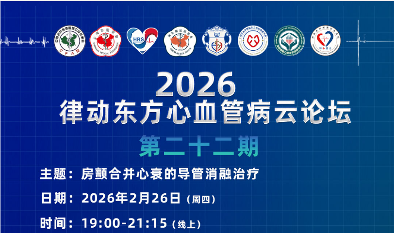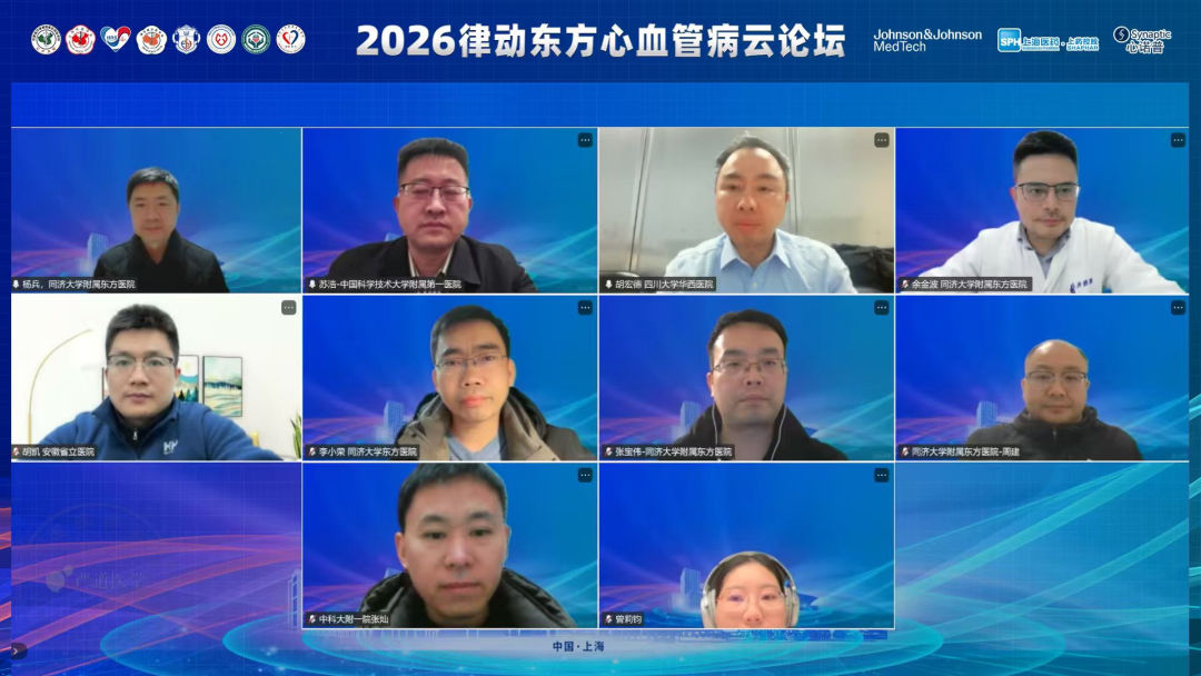 2026年2月26日,第二十二期“2026律动东方心血管病云论坛”于云端圆满落幕。本期云论坛由同济大学附属东方医院杨兵教授担任大会主席,中国科学技术大学附属第一医院苏浩教授和四川大学附属华西医院胡宏德教授担任联合主席。会间由同济大学附属东方医院余金波教授和张旭敏教授担任主持嘉宾。