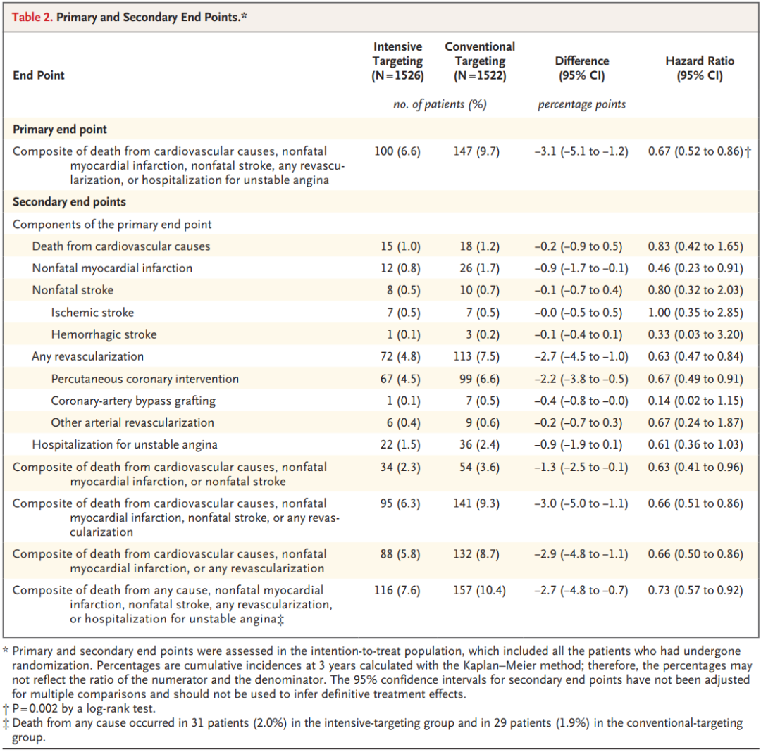 主要终点为随机化后3年内的复合终点,包括心血管原因死亡、非致死性心肌梗死、非致死性卒中、任何血运重建、因不稳定型心绞痛住院。