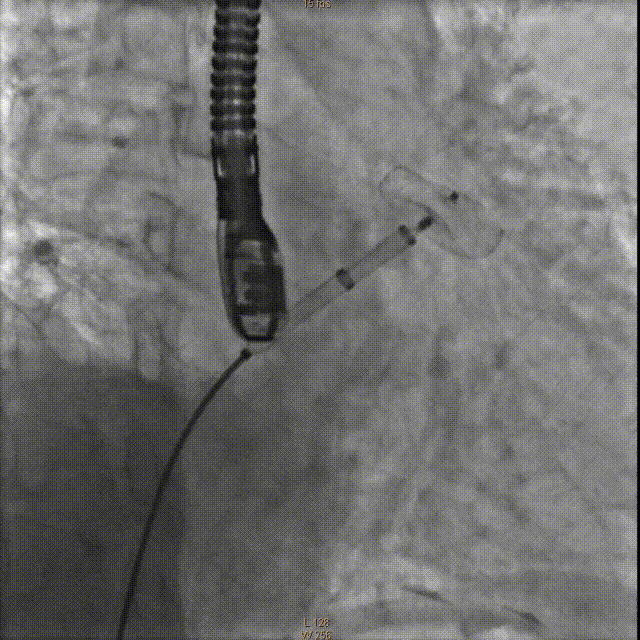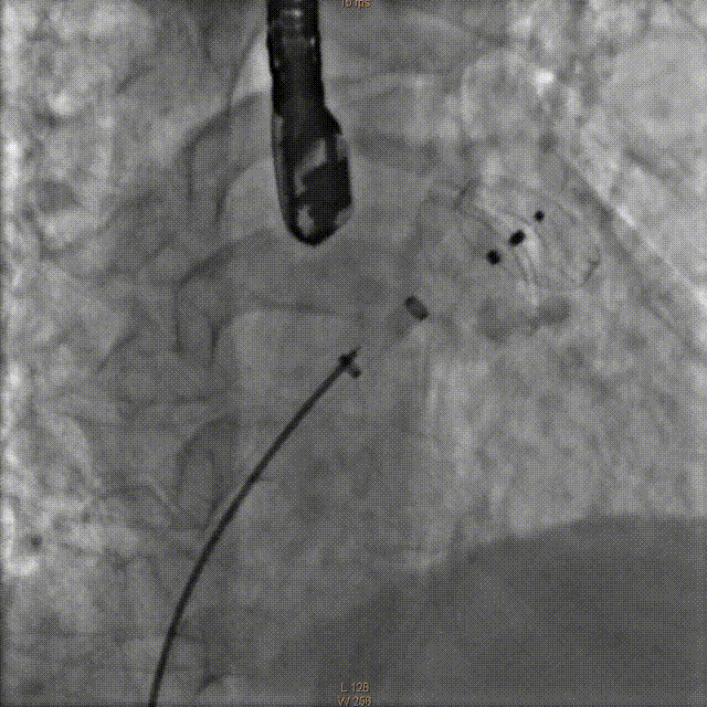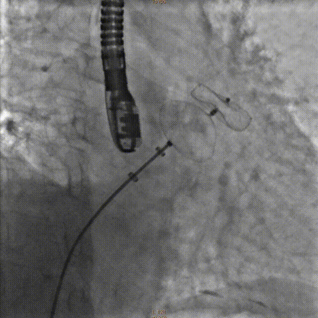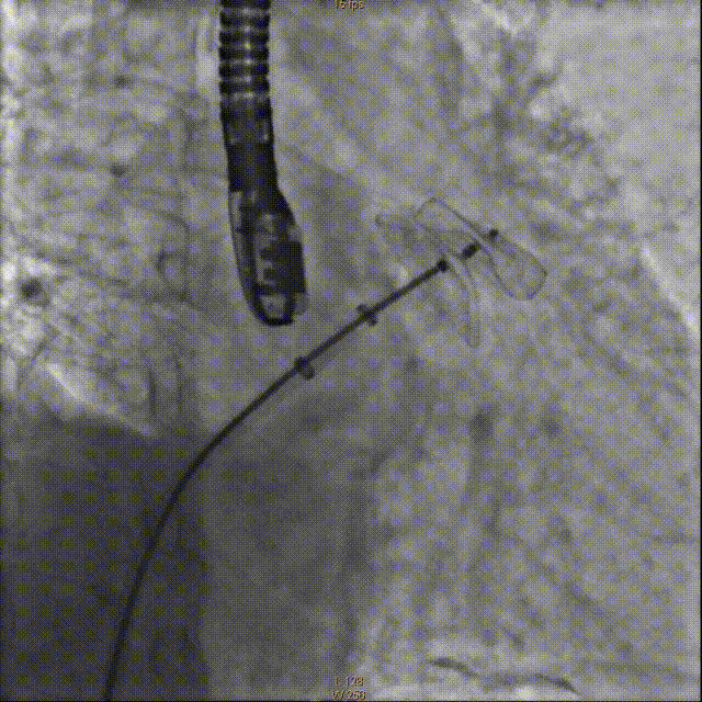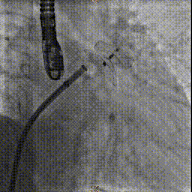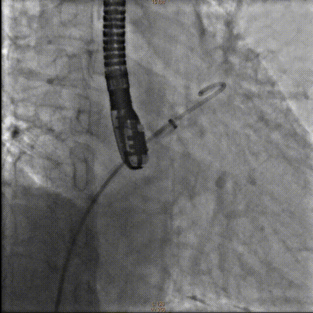 牵拉实验固定稳妥,无明显心包积液,透视下释放左心耳封堵器于左心耳。退出输送鞘管至右房测右房压12/5mmHg:撤出传送钢丝及血管穿刺鞘。