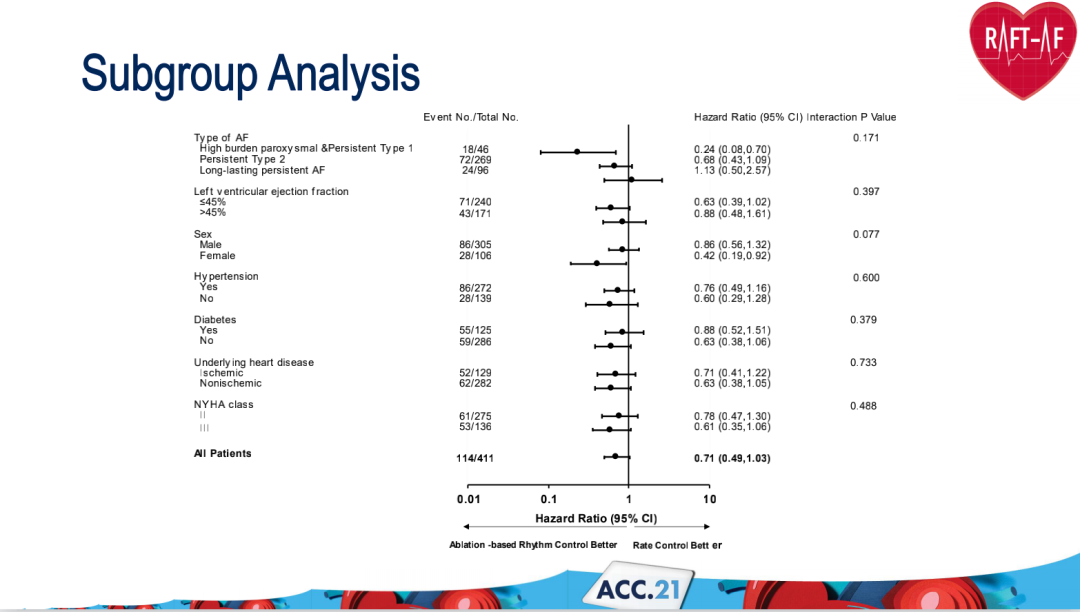 1. 在这项针对房颤和心衰患者的试验中,以消融为基础的心律控制与心率控制相比,降低全因死亡率和心衰事件没有达到统计学意义。