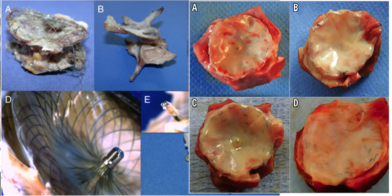 目前国内外临床使用封堵器的核心主体均为镍钛合金丝密集编织的双盘一腰“工”字形的结构,使得封堵之后左右心房之间被密集网格、小网孔的双盘四层金属网隔绝,且双盘的多层阻流膜之间会产生肥厚的纤维增生组织(图2),使得要从封堵器中央穿刺通过器械几乎不可能,丧失房间隔这一重要介入治疗通道。进行房间隔缺损封堵的病人多为年轻病人,后期并发心房颤动、二尖瓣反流、肺动脉高压等疾病概率高达30% (Yang et al. 2020, Ortega et al. 2020)。这些并发疾病可采用射频消融、二尖瓣夹合、左心耳封堵、房间隔造口等穿刺房间隔进入左心房进行微创介入的手术进行治疗。若房间隔封堵术后出现这些并发症的患者,由于房间难以穿刺,进行上述微创的介入治疗手术几乎不可能,使得患者丧失接受微创介入治疗的机会。因此。设计一种可以简便的进行穿刺且安全有效的房间隔封堵器是十分有必要,能满足临床需求。