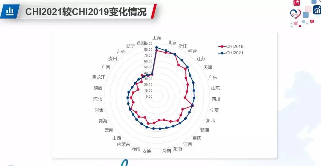上海市以83.27分位列全国第一,北京市、浙江省、福建省、江苏省、天津市分别取得第二到六名,共有14个省市在全国CHI水平线上(图表2)。值得关注的是,尽管排名升降变化较大,但大部分省份的CHI分数均有较多提升(图表3)。如何对结果进行科学、高效地解读,霍勇教授提出要有正确的“三观”——整体观、动态观、改进观。整体观,既要认识到严峻的形势,又要看到各界的努力。动态观,即动态地观察,不仅要横向对比,还应进行纵向观察。所谓改进观,顾名思义,通过分析各个维度各项指标,寻求改进空间。