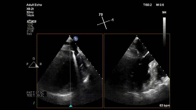 患者术前二尖瓣后叶脱垂、腱索断裂伴重度反流,由于患者伴有慢性肾功能不全,外科手术风险较高。经过中山心脏团队综合分析及评估,决定使用由北京迈迪顶峰公司与中山医院历时5年研发成功的E-Chord™二尖瓣修复装置为该患者行“穿刺式二尖瓣腱索重建术”。