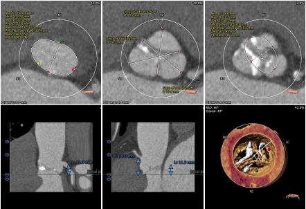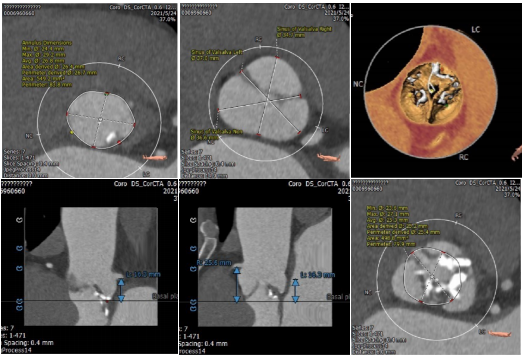 杨毅宁教授团队术前讨论,考虑患者三叶式主动脉瓣,中度钙化,且钙化分布不均匀主要分布于无冠窦,瓣膜植入过程中对假造成体挤压形变,需关注瓣周漏风险。患者左冠高都略低,测量发现瓣叶长度接近-超过左冠开口,可能形成冠脉阻挡风险。