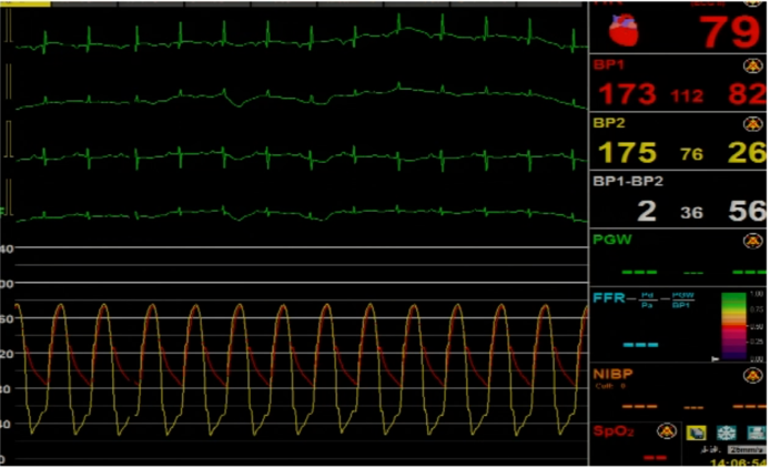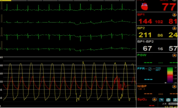 主动脉弓部夹角略锐,角度84度,最短距离70.3mm,必要时可采取Snare辅助过弓;外周入路血管条件良好,无钙化,未发现其他血管病变,双侧入路血管管径可。