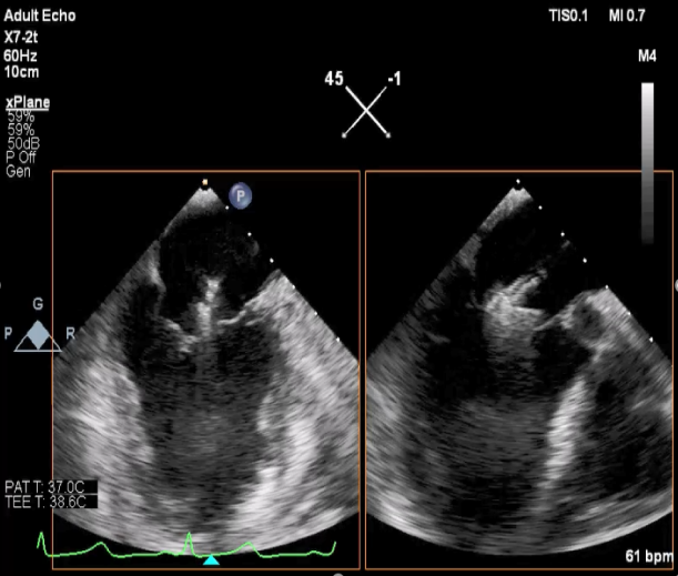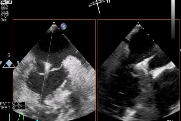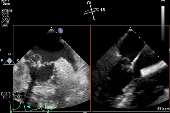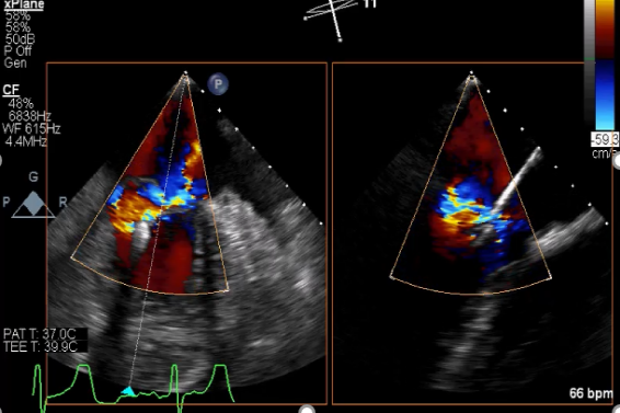 患者麻醉方式同样采取全麻,建立静脉通路后,穿刺右侧股静脉后,预埋ProGlide缝合器后,送导管至房间隔部位,成功穿刺房间隔后进入左房,调整导管角度,顺利到达二尖瓣目标位置,后在X线及食道超声联合辅助下,宋光远教授使用2枚XTR二尖瓣夹,在精确定位后,准确夹合二尖瓣A2-P2以及A3-P3区域,患者收缩压即刻上升30mmHg,左心房收缩压由62mmHg下降至28mmHg,术中测反流面积明显减少,肺静脉多普勒波形由反向恢复正常。手术顺利结束,术后患者即刻苏醒,安返病房。