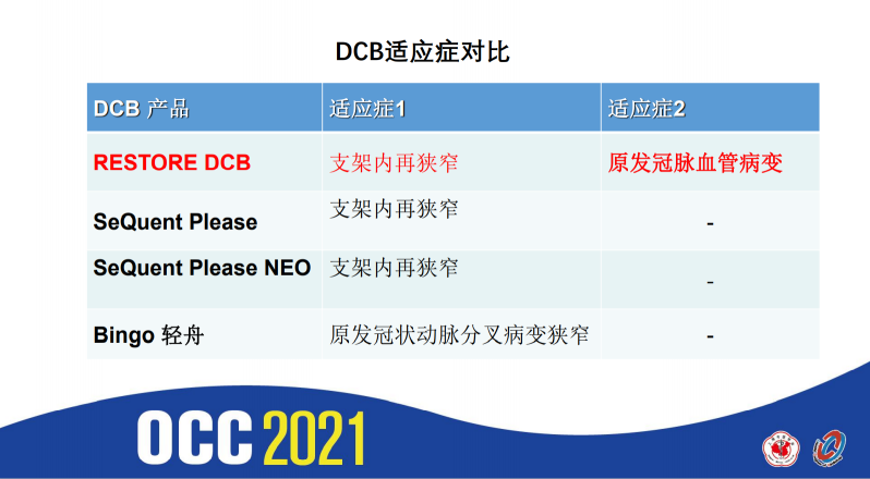 2016年DCB中国专家共识指出,DCB可用于多种冠脉狭窄,多项临床试验也证实了DCB在治疗多种冠脉狭窄病变、小血管病变以及分叉病变等方面具有良好的疗效和安全性。目前RESTORE DCB的获批适应证包括了支架内再狭窄病变和原发冠脉血管病变(2.00mm≤参考血管直径≤2.75mm)。