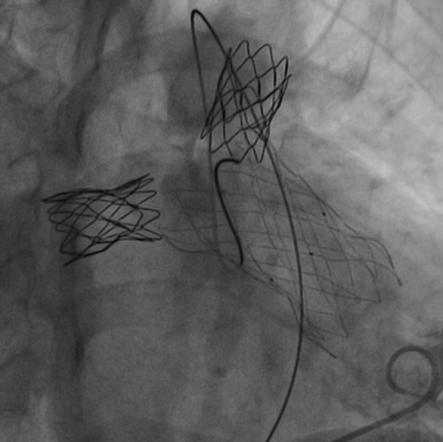 患者在全麻下,首先从左股静脉将造影导管分别送至右心室和肺动脉主干,行造影以明确右室流出道、肺动脉及肺动脉分支的基本情况。同时测量了右室流出道及肺动脉的尺寸。随后输送器通过右侧股静脉延加硬导丝将瓣膜输送到右室流出道,在X线的引导下,将瓣膜精确定位到植入部位并顺利进行瓣膜释放,无反流和瓣周漏,手术效果十分理想。