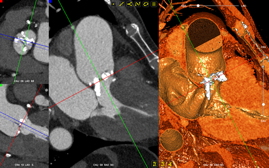 主动脉瓣二瓣化畸形重度钙化并重度狭窄(钙化积分达1368)、升主动脉扩张;平均跨瓣压差为52mmHg;左室舒张末直径41 mm;EF 51%。