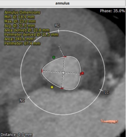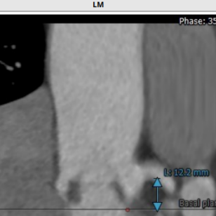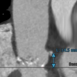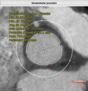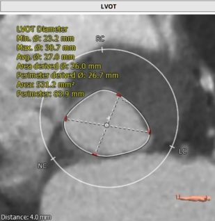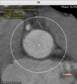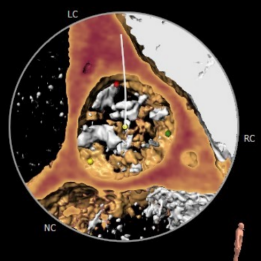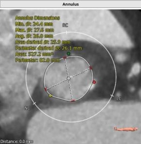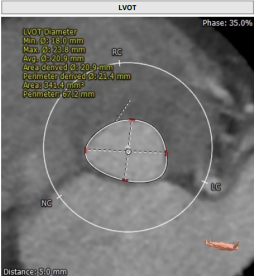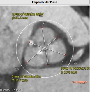 术前CT结果显示,患者主动脉瓣瓣环周长:67.4 mm,平均瓣环直径:21.5mm。左流出道平均直径20.9mm,瓦氏窦最小径31.7mm,窦管结合交界处(STJ)28.4mm,风湿性心脏病,三叶瓣,轻度钙化,瓣叶明显增厚,钙化,左冠开口高度12.2mm,右冠开口高度16.1mm,结合瓦氏窦内径,瓣叶长度及度钙化分布等综合因素考虑,冠脉风险较低,双侧入路血管直径尚可,无明显钙化,最小直径为5.5mm。