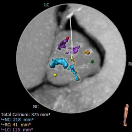 患者为71岁女性 ,主诉心悸。胸闷,活动后气促。既往高血压,甲亢,口服药物治疗,控制可。心脏超声检查示主动脉瓣重度狭窄并重度返流,收缩期主动脉瓣峰值血流速度5.06m/s,峰值压差103mmHg,平均压差53mmHg ,主动脉瓣明显增厚,钙化挛缩,瓣叶开放互动受限。