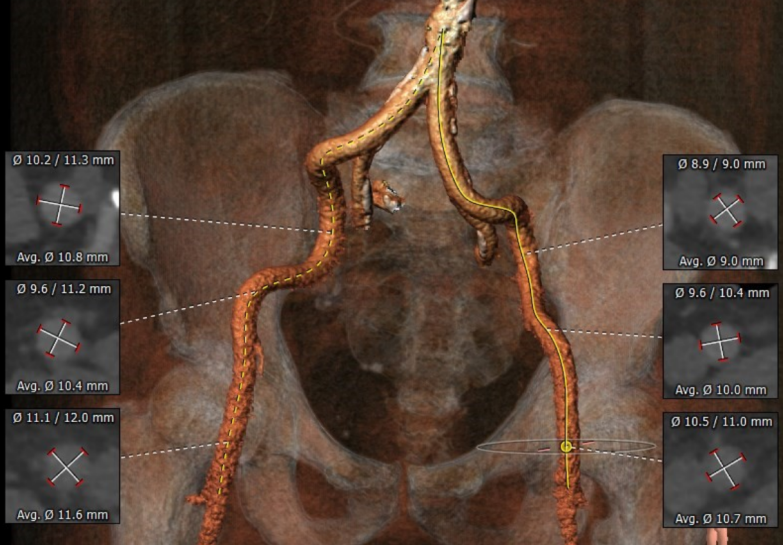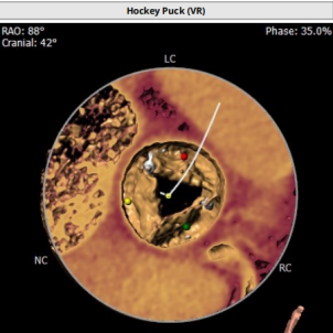 术前CT结果显示,患者主动脉瓣瓣环周长:82mm ,平均瓣环直径:26.1mm,左流出道平均直径27.0mm,瓦氏窦最小径32.5mm,窦管结合交界处(STJ)31.1mm,三叶瓣,中度钙化,钙化分布不均匀,主要位于无冠窦,瓣叶未见增生肥厚。左冠高度尚14.5,右冠高度9.9,可见右冠高度略低,结合瓣叶长度,瓣叶钙化分布等综合因素考虑,术中存在一定的冠脉遮挡风险。双侧入路血管直径尚可,无明显钙化,最小直径为8.9mm。