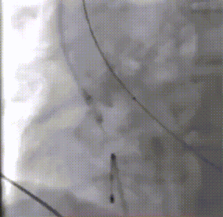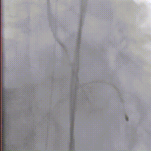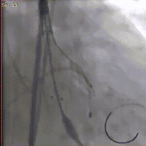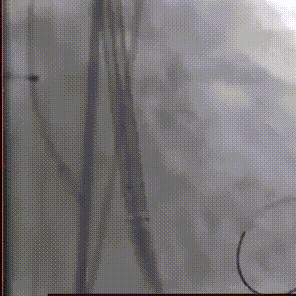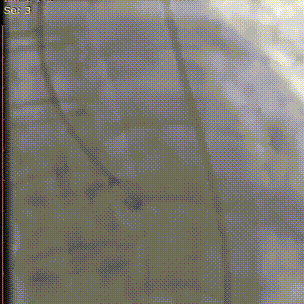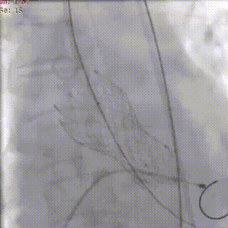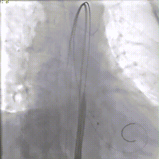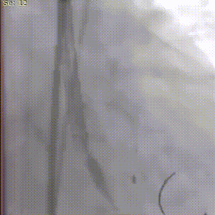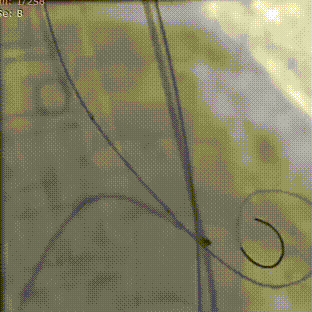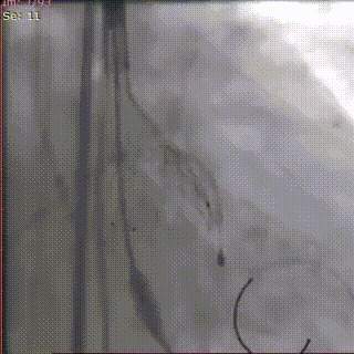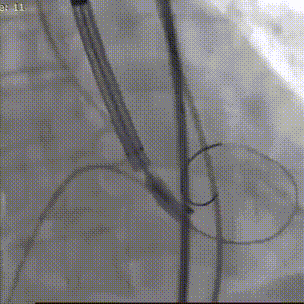 手术过程(三):第二次释放时,瓣膜植入深度在0-2 mm,快速起搏后缓慢释放瓣膜,顺利完成释放。释放完成后,行DSA评估瓣膜释放情况,可见反流量明显减少。超声结果显示即可跨瓣压差几乎为零。