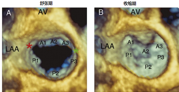 二尖瓣按照局部分页情况,前叶和后叶可以分为A1、A2、A3、P1、P2及P3(图4)。