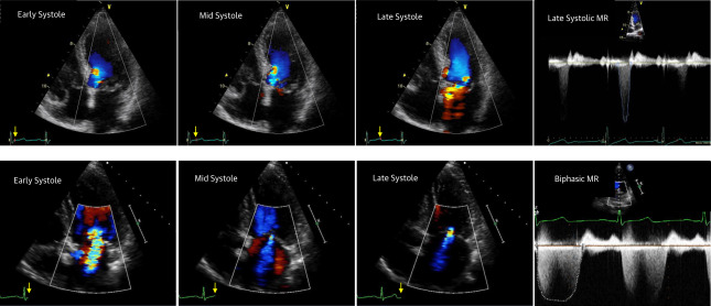 MR具有动态特征,其严重程度随左室负荷变化而变化,在短期内都可能出现明显变化。例如,与清醒状态下TTE评估相比,TEE术中的镇静和血压降低可能会显著降低MR的严重程度;高血压急症出现严重的MR,通过控制血压可显著改善;肥厚性梗阻性心肌病,后负荷的减少预计也会增加MR的严重程度。更有甚者,MR的严重程度在不同心动周期内都可能动态的,不同心动周期反流程度不同。