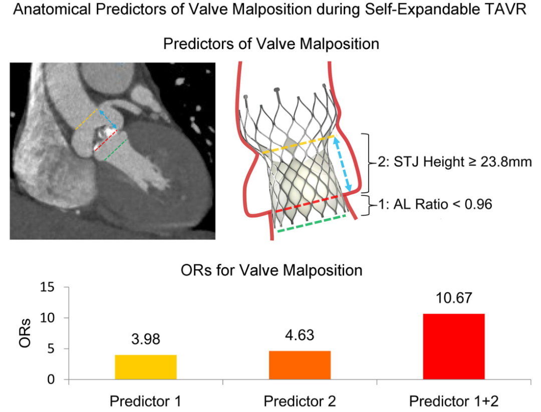 目前我国TAVR以自膨瓣为主,据文献报道,自膨瓣瓣膜移位的发生率高于球扩瓣。国外研究表明,二叶瓣和瓣膜严重钙化的患者瓣膜移位的发生率更高。我国患者二叶瓣比例高,瓣膜钙化更严重,因此,我国使用自膨瓣的TAVR患者面临的瓣膜移位风险不容忽视。罗建方教授团队最新研究表明,锥形的左室流出道【瓣环周长/左心室流出道周长(AL)比值<0.96】和高大的窦部结构【窦管结合部(STJ)高度≥23.8mm】是自膨瓣瓣膜移位的独立预测因素。如果同时满足以上2个条件,瓣膜移位的风险将大大增加(OR=10.67)(图1)。该研究结果发表于最新一期的知名心血管病杂志《Frontiers in Cardiovascular Medicine》(IF=6.050)。