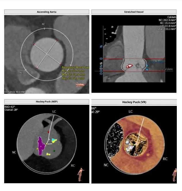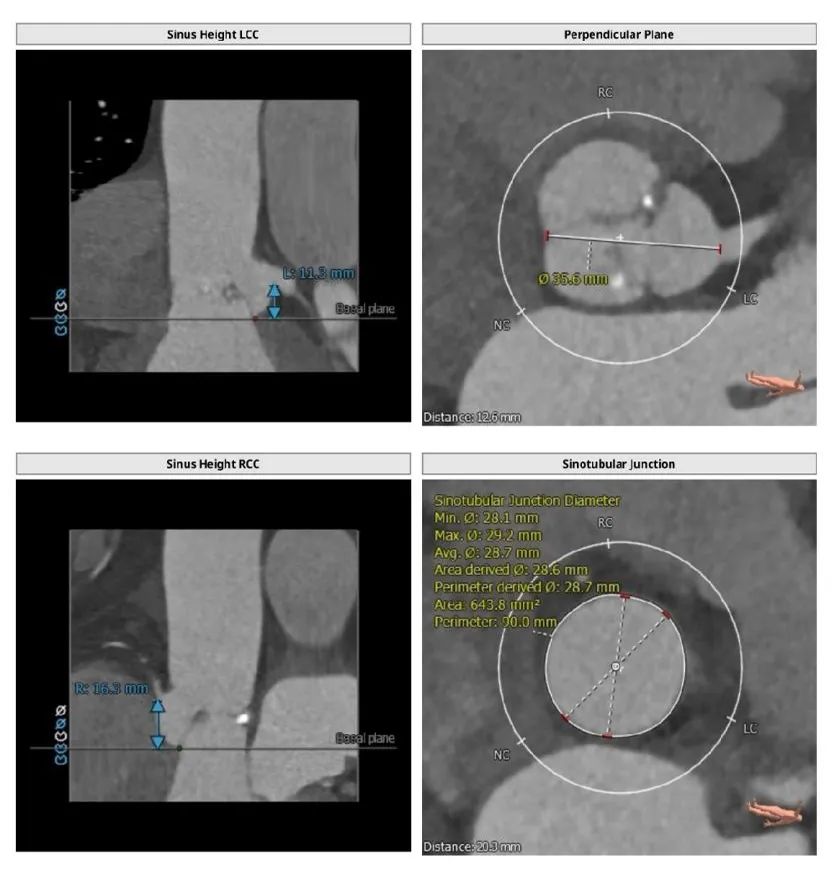 本例患者三叶瓣,重度钙化,左右冠瓣融合,病人瓣环25.2,左室流出道26.9,AL比值=0.93,法氏窦结构长短径均超过30,其中长径35.6,左右冠高度均超过12,瓣叶稍增厚,Stj28.7,距离虚拟瓣环平面23.3mm,综合解剖学因素,同时满足AL比值<0.96以及STJ高度≥23.8mm两个因素,发生瓣中瓣可能性极大。广东省医Tavr团队决定使用Numed25球囊预扩,预装VenusA29号瓣膜进行手术预案。