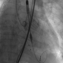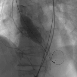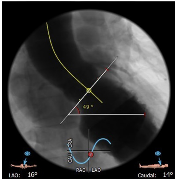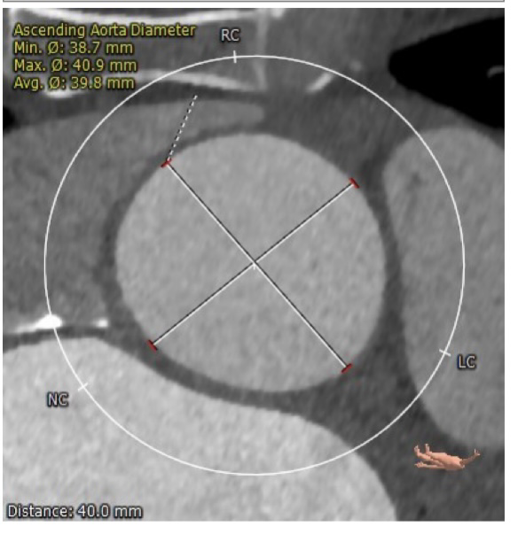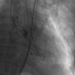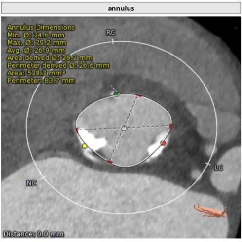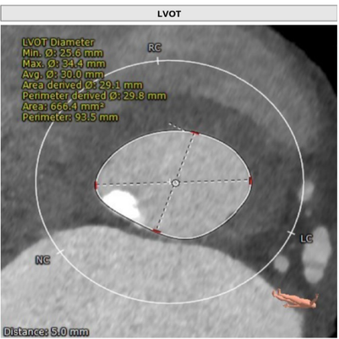 该病例为:Type1型二叶式主动脉瓣,重度钙化并严重增厚,法式窦结构大,双冠脉开口高度良好,主动脉瓣环夹角可,非横位心,主动脉弓夹角锐利,弓距可,左心室腔增大,推荐右侧股动脉为主入路,左侧辅助入路,建议使用20F戈尔血管鞘,备SNARE;推荐跨瓣角度LAO26°CRA5°左右,推荐使用22mm球囊预扩,角度为LAO22°CRA2°(左冠切线位);推荐预装L26瓣膜,释放角度RAO21°CAU35°(左右重合),释放高度推荐较高位(瓣环下0-2mm)。