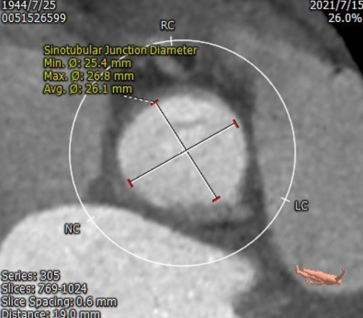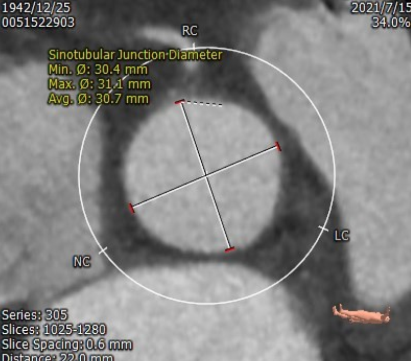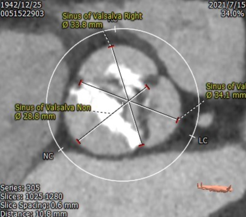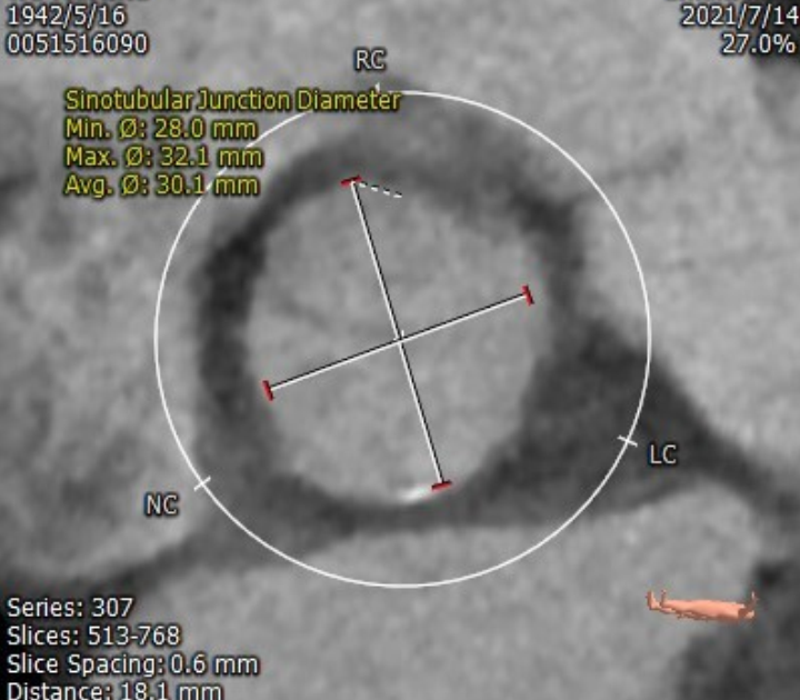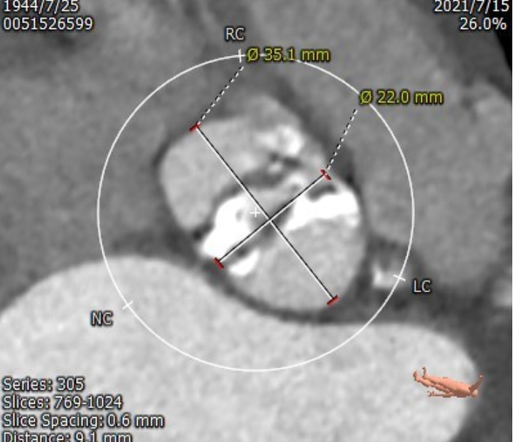 患者为78岁男性,主因“活动后喘憋1年余,突发晕厥9天”入院,诊断“主动脉瓣重度狭窄并轻度反流、心功能II级(NYHA分级)”。STS评分11.263%。