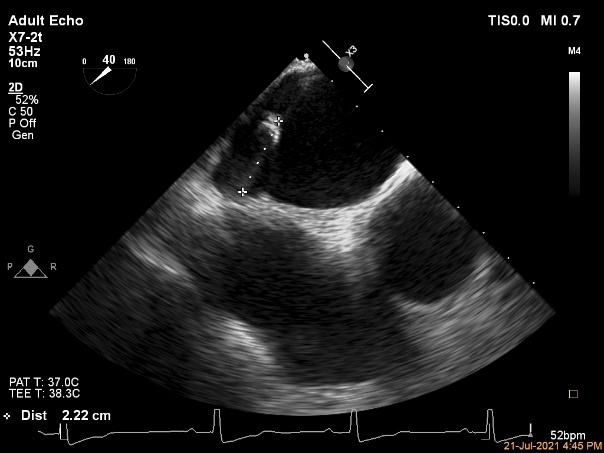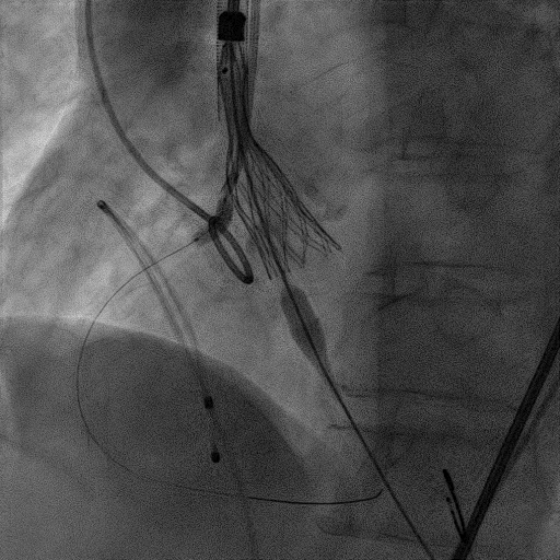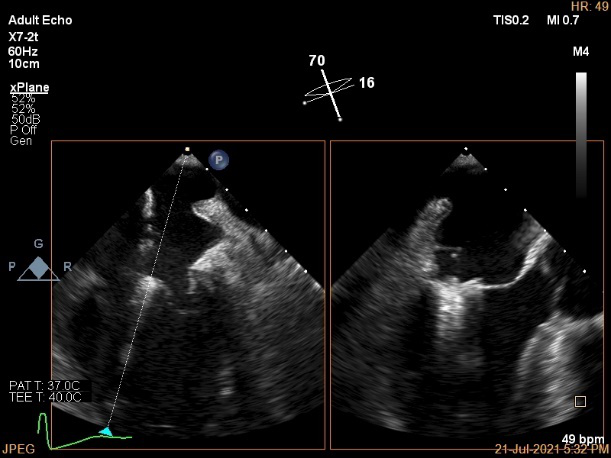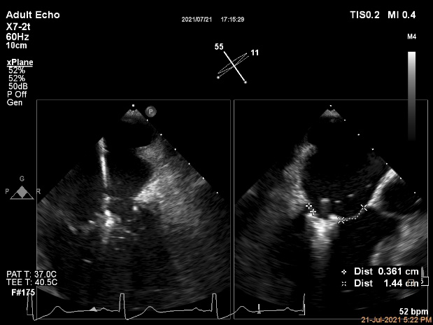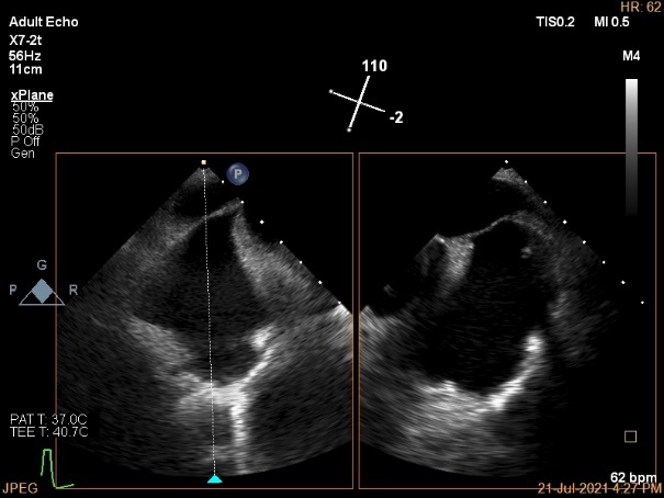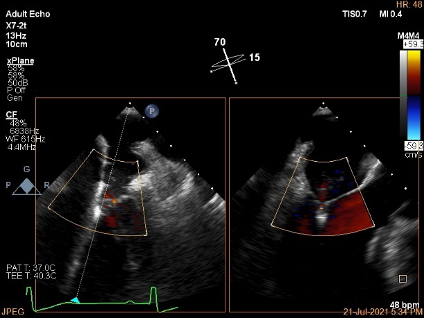 麻醉方式为全麻,建立静脉通路后,穿刺右侧股静脉,预埋ProGlide缝合器,食道超声指导下房间隔穿刺成功,鞘管扩张穿刺部位,沿导丝将导引导管送入左房,MitraClip调整后顺利到达二尖瓣目标位置,在X线及食道超声辅助下,将MitraClip NTR二尖瓣夹精确定位后,成功夹合二尖瓣A2-P2区,超声显示反流明显减少,多切面证实夹合组织充分,肺静脉多普勒波形由反向恢复正常,手术顺利结束,安返普通病房。