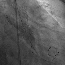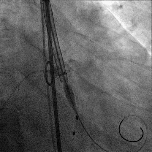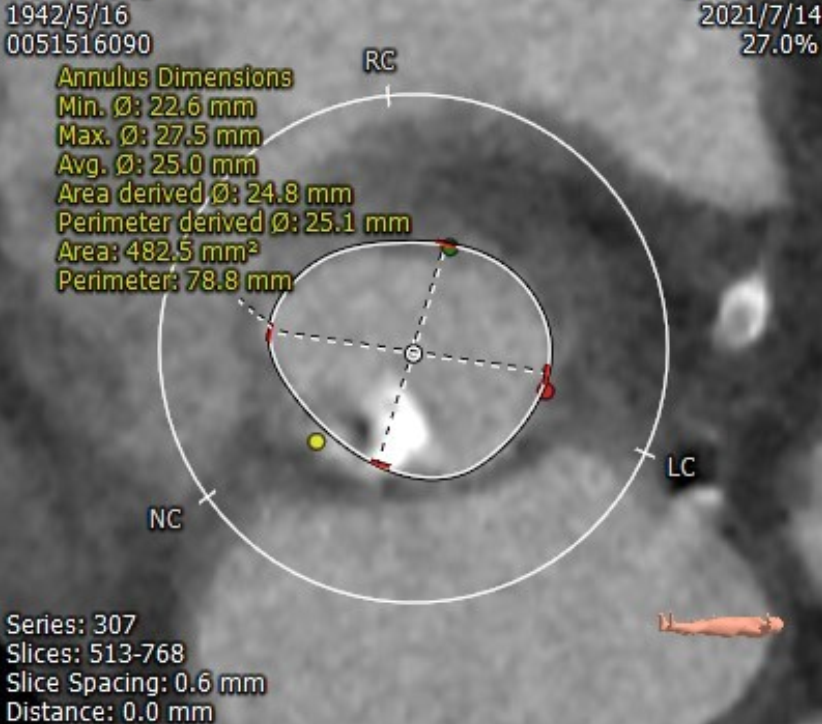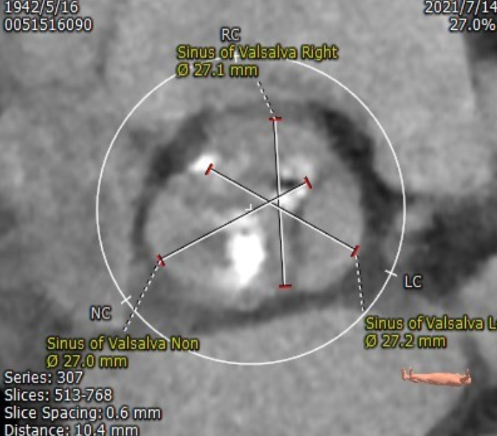 功能性二叶瓣,左右融合,钙化集中于无冠窦,长条状钙化自瓣上延续至二尖瓣前叶,冠脉开口高度可,腹主动脉至髂动脉多发钙化,内径可,拟右股动脉入路,22mm球囊扩张,植入VitaFlow 27。