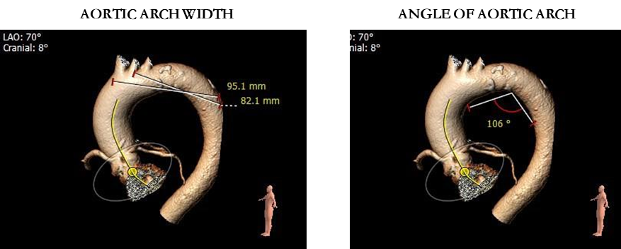 4. 主动脉瓣环与水平面夹角可,主动脉弓角度与宽度可。入路血管局限少量钙化,双侧血管内径良好,整体入路血管条件尚可。
