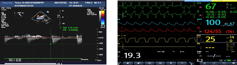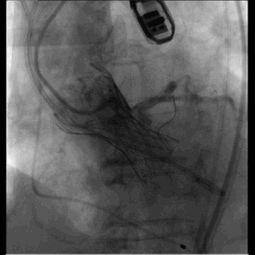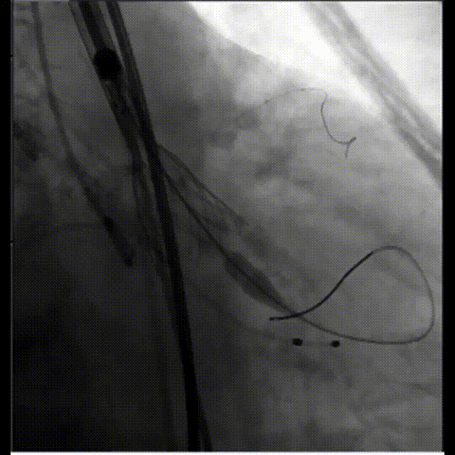 患者为74岁女性,左房增大、心功能IV级,患者2年前无明显诱因出现活动后气促,伴夜间阵发呼吸困难,双下肢间断水肿。超声提示:主动脉瓣增厚并明显钙化,开放明显受限,重度狭窄,微量反流;主动脉瓣上收缩期峰值流速Vmax=4.68m/s,峰值压差88mmHg,平均压差42mmHg,瓣下见反流,面积约1.9cm²。心电图提示患者窦性心律,左室肥大,T波改变,拟进行经导管主动脉瓣置换术进行治疗。