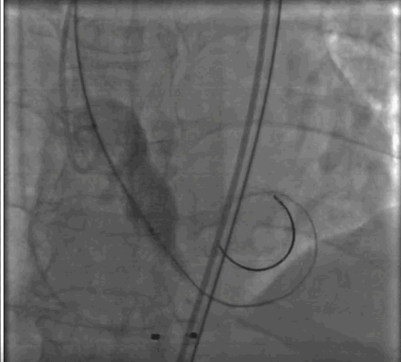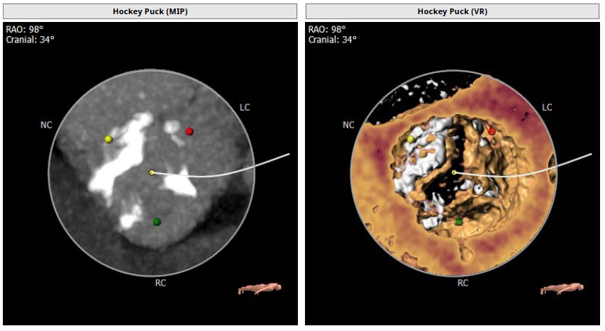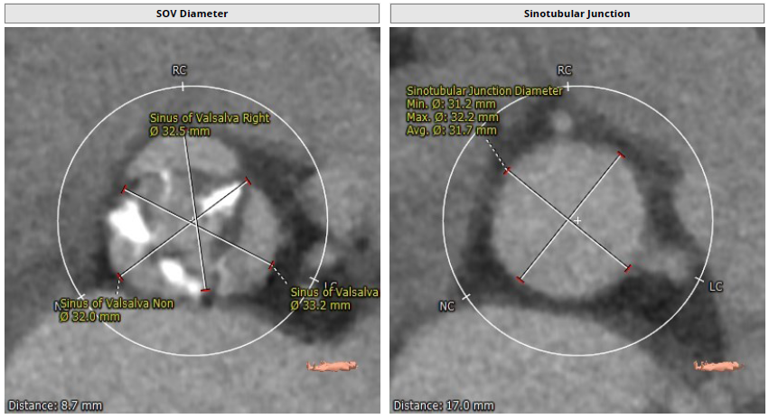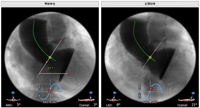 该病例为老年女性,主动脉瓣重度狭窄伴有轻度反流。CT及超声检查提示三叶式主动脉瓣,瓣膜钙化重度钙化,右无冠窦钙化较多,主动脉弓长度可,瓣环角度为57°,左、右冠脉开口高度13mm,但瓣叶增厚绵长,左右冠脉术中均有堵塞风险因此瓣膜选择及释放均需十分谨慎,并预先做双侧冠脉。双侧股动脉直径可,综合评估考虑右股动脉更适宜为主入路。