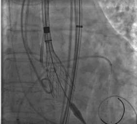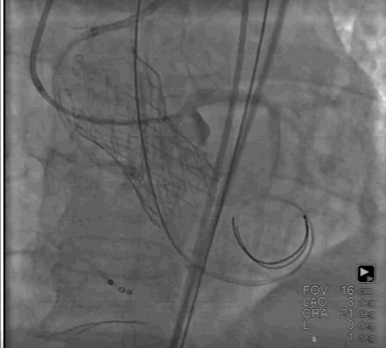 按照预先制定手术策略,首先,周玉杰教授内科团队首先进行左右冠脉保护,然后进行超硬导丝跨瓣进,23mm快速起搏预扩,左右冠脉均无显影,证实冠脉预先评估无误,选择右冠脉居中体位释放,利用瓣膜底部与无冠猪尾导管定位,快速起搏开始释放,释放至限位,由于是可回收系统进行多次反复观察评估冠脉情况,释放位置稳定较好,确认冠脉无风险完全释放瓣膜,撤出体外。