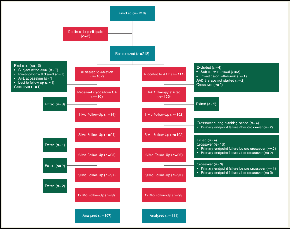 研究人群:218例首诊的症状性房颤患者随机(1:1)分成两组,分别接受冷冻球囊消融(Arctic Front Advance, Medtronic)或药物治疗(I或III类抗心律失常药物)治疗,随访12个月(图1)。