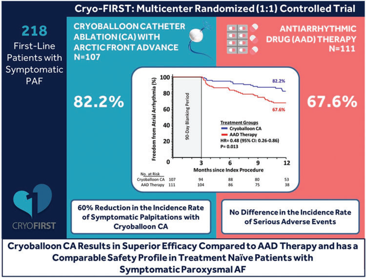 Kuniss M, Pavlovic N, Velagic V, et al; Cryo-FIRST Investigators. Cryoballoon ablation vs. antiarrhythmic drugs: first-line therapy for patients with paroxysmal atrial fibrillation. Europace. 2021 Jul 18;23(7):1033-1041. doi: 10.1093/europace/euab029. PMID: 33728429; PMCID: PMC8286851.
